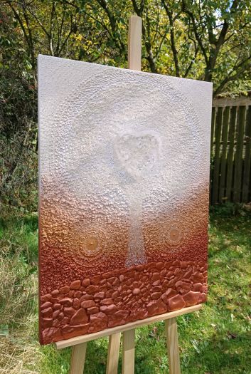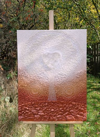 Obraz barevnou kompozicí přináší hřejivý pocit útulného, klidného, laskavého a harmonického domova. Je spojením s místem síly, důvěry, jistoty a bezpečí. Je vytvořen z darů přírody – pískových kamenů a křišťálů v doplnění podporujících zemitých barev, které povznáší. Strom je symbolem spojení, růstu a síly.
