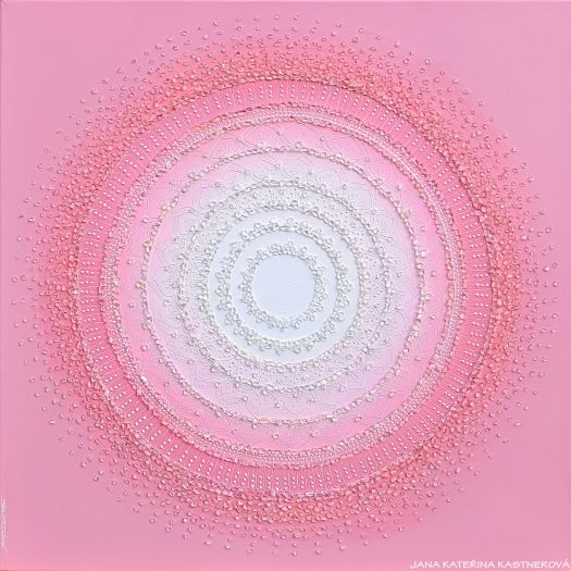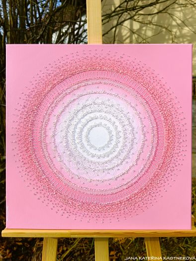 ORIGINAL, malba/ kresba na plátno 50x50cm technikou akryl v doplnění mnoha drobných diamantových křišťálků, které jsou jednotlivě kus po kusu ručně komponovány do obrazu. Součástí obrazu je jednoduchá meditace. Malebnou podmalbu obrazu lze vytvořit blahodárným tichem bo souznící meditační hudbou ladící s vaší momentální přítomností.