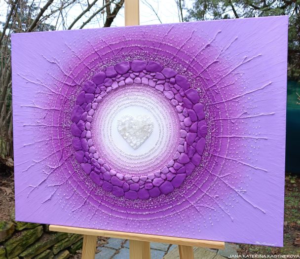 Intuitivní obraz inspirovaný přírodou, sluncem, srdcem a jeho jedinečným rytmem, který žijeme a většinu času vědomě nevnímáme, kameny, hloubkou jednoduchosti, laskavostí, zemitostí a dokonalou souhrou všeho, co souvisí, ladí a vytváří pevný harmonický celek. Obraz je spojením s místem síly a bezpečí. Je to pozitivec, který odnáší do radostného přesahu.