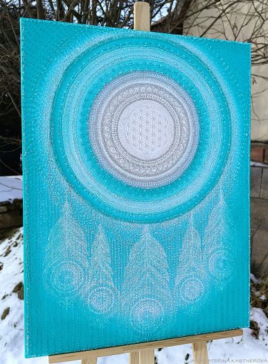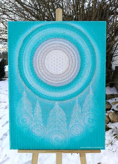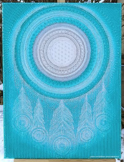 ORIGINAL, malba/ kresba na plátno 60x80cm technikou akryl v doplnění mnoha drobných diamantových křišťálů, které jsou jednotlivě kus po kusu ručně komponovány do obrazu. Součástí obrazu je jednoduchá meditace a související text na téma ... TYRKYSOVÝ LAPAČ SNŮ ... Malebnou podmalbu obrazu lze vytvořit blahodárným tichem bo souznící meditační hudbou ladící s vaší momentální přítomností.
