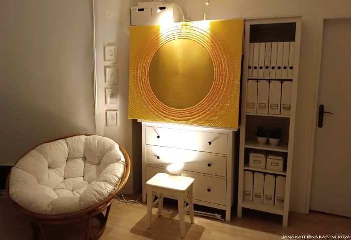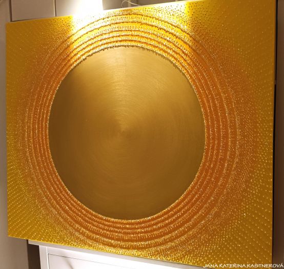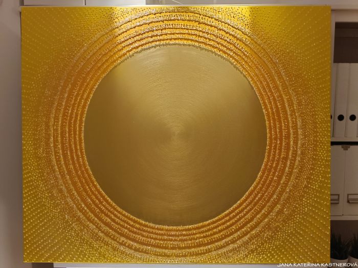 ORIGINAL, malba na plátno 120x100cm technikou akryl se zakomponováním mnoha drobných diamantových křišťálků. Střed obrazu je tvořen zlatým prostorem v kruhu. Součástí obrazu je související text ... SLUNCE ... a jednoduchá meditace. Malebnou podmalbu obrazu lze vytvořit tichem bo hudbou souznící s vaší přítomností a naladěním sluchových pohárků.