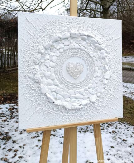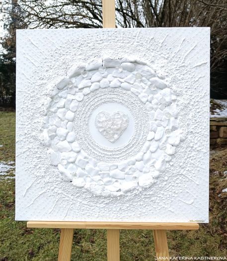 ORIGINAL, malba na plátno 60x60cm technikou akryl v doplnění mnoha drobných křišťálků, pískových kamenů, větviček lesních stromů. Součástí obrazu je jednoduchá meditace a související text na téma … MOTIV PŘÍRODY - BÍLÁ … . Malebnou podmalbu obrazu lze vytvořit blahodárným tichem bo souznící meditační hudbou ladící s vaší momentální přítomností.