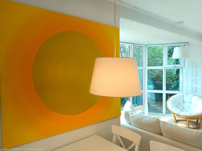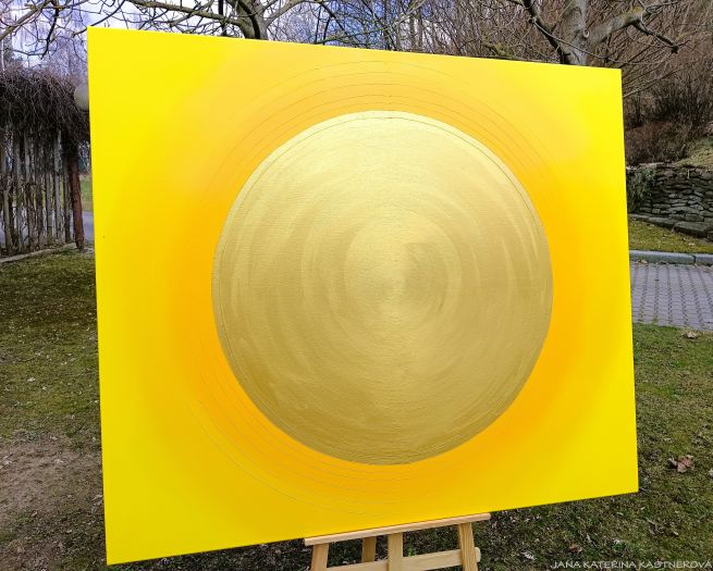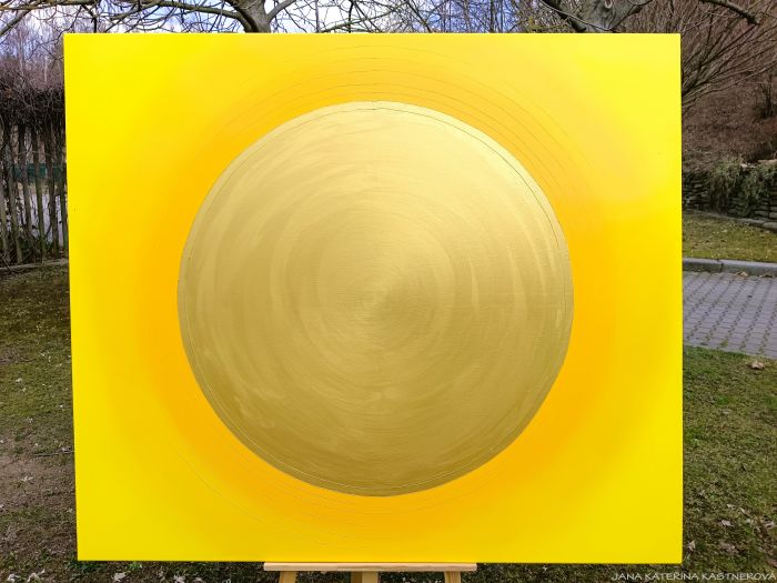 ORIGINAL, malba na plátno 150x130cm technikou akryl se zakomponováním mnoha drobných diamantových křišťálků. Střed obrazu je tvořen zlatým prostorem v kruhu. Součástí obrazu je související text ... SLUNCE ... a jednoduchá meditace. Malebnou podmalbu obrazu lze vytvořit tichem bo hudbou souznící s vaší přítomností a naladěním sluchových pohárků.