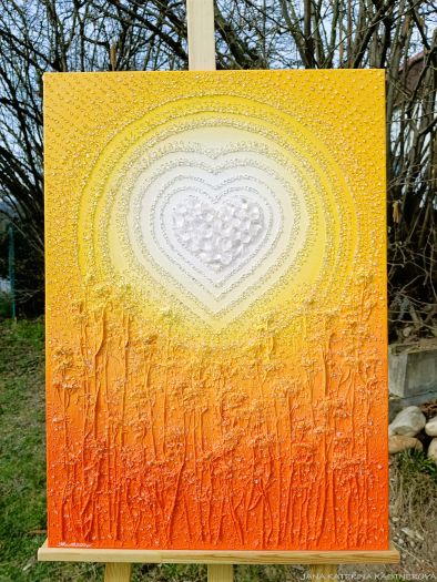 ORIGINÁL - malba na plátno o rozměrech 50x70 cm, vytvořená technikou akryl v kombinaci s množstvím drobných i větších diamantových křišťálů, které jsou každý jednotlivě ručně komponovány do obrazu. Součástí kompozice jsou také zahradní bylinky (dobromysl), symbolizující klid a harmonii. K obrazu je připojena jednoduchá meditace, která umocňuje jeho energetické působení. Malebnou podmalbu lze nejlépe tvořit v atmosféře blahodárného ticha nebo při poslechu meditační hudby, ladící s vaší aktuální přítomností a vnitřním naladěním.