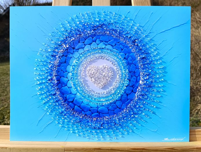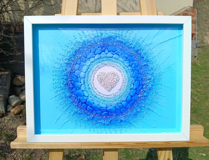 MODRÝ MOTIV PŘÍRODY – KŘIŠŤÁLOVÉ SRDCE - reprodukce obrazu - tisk na kvalitní grafický papír velikosti 30x40cm, v bílém rámu s vyšším profilem, ručně doplněn diamantovými křišťály