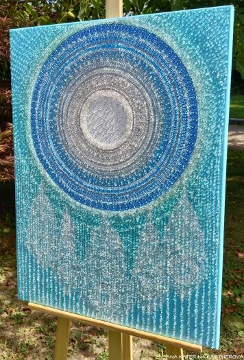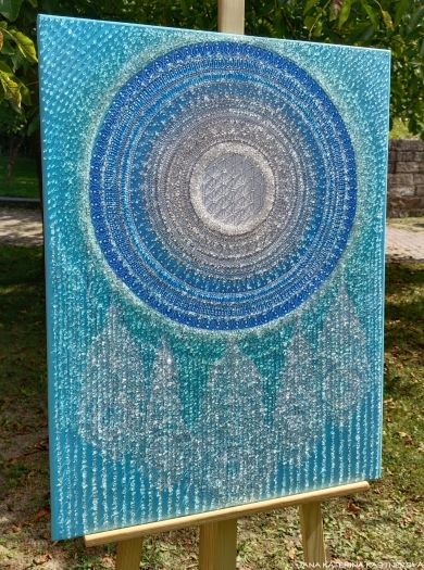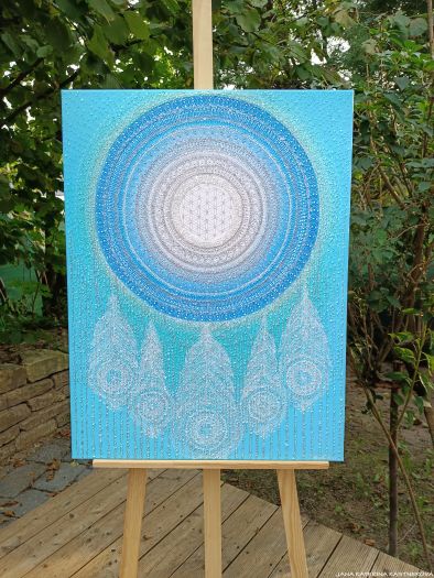 ORIGINAL, malba/ kresba na plátno 80x60cm technikou akryl se zakomponováním mnoha drobných křišťálků. Střed mandaly LAPAČE SNŮ tvoří KVĚT ŽIVOTA, který je symbolem matrice, kosmického řádu, podstaty života - harmonizuje, povzbuzuje, chrání, násobí bílé, odstíňuje černé. Součástí obrazu je související text ... LAPAČ SNŮ ... a jednoduchá meditace. Malebnou podmalbu obrazu lze vytvořit hudbou souznící s vaší přítomností a naladěním sluchových pohárků.