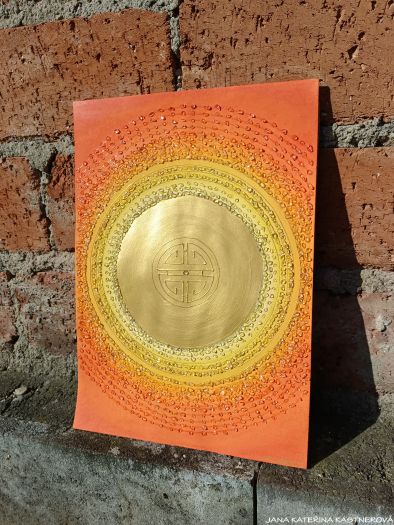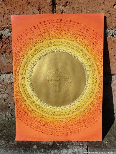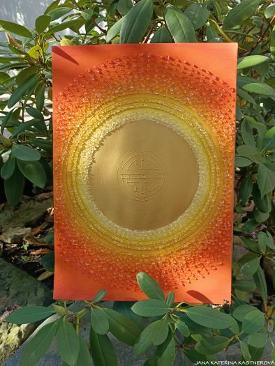 Obraz barevnou kompozicí blahodárně působí zejména na 2., 3. čakru, místo síly, sluníčko našeho Bytí, které zrcadlí míru světla našeho Žití a 4. čakru.