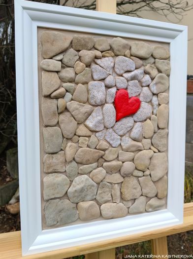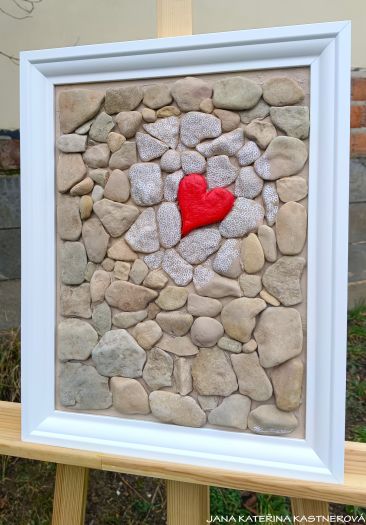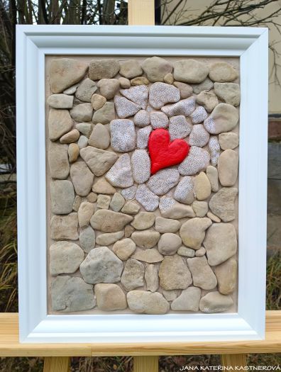 ... LÁSKA-VÍ ... - original, sololit v bílém rámu 30x40cm, hliněné srdíčko s pískovými kameny