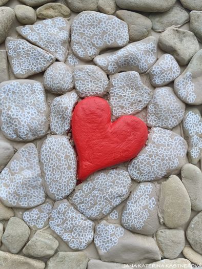ORIGINAL, malba na sololit 30x40cm technikou akryl v doplnění mnoha pískových kamenů a červeného hliněného SRDÍČKA. Součástí obrazu je jednoduchá meditace a související text. Malebnou podmalbu obrazu lze vytvořit blahodárným tichem bo souznící meditační hudbou ladící s vaší momentální přítomností.
